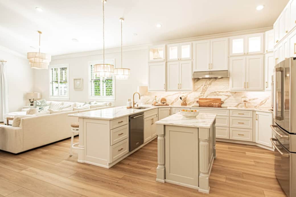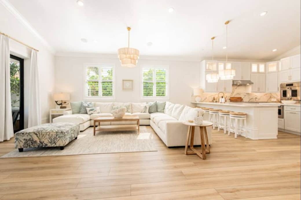 Open concept with modern coastal decor.